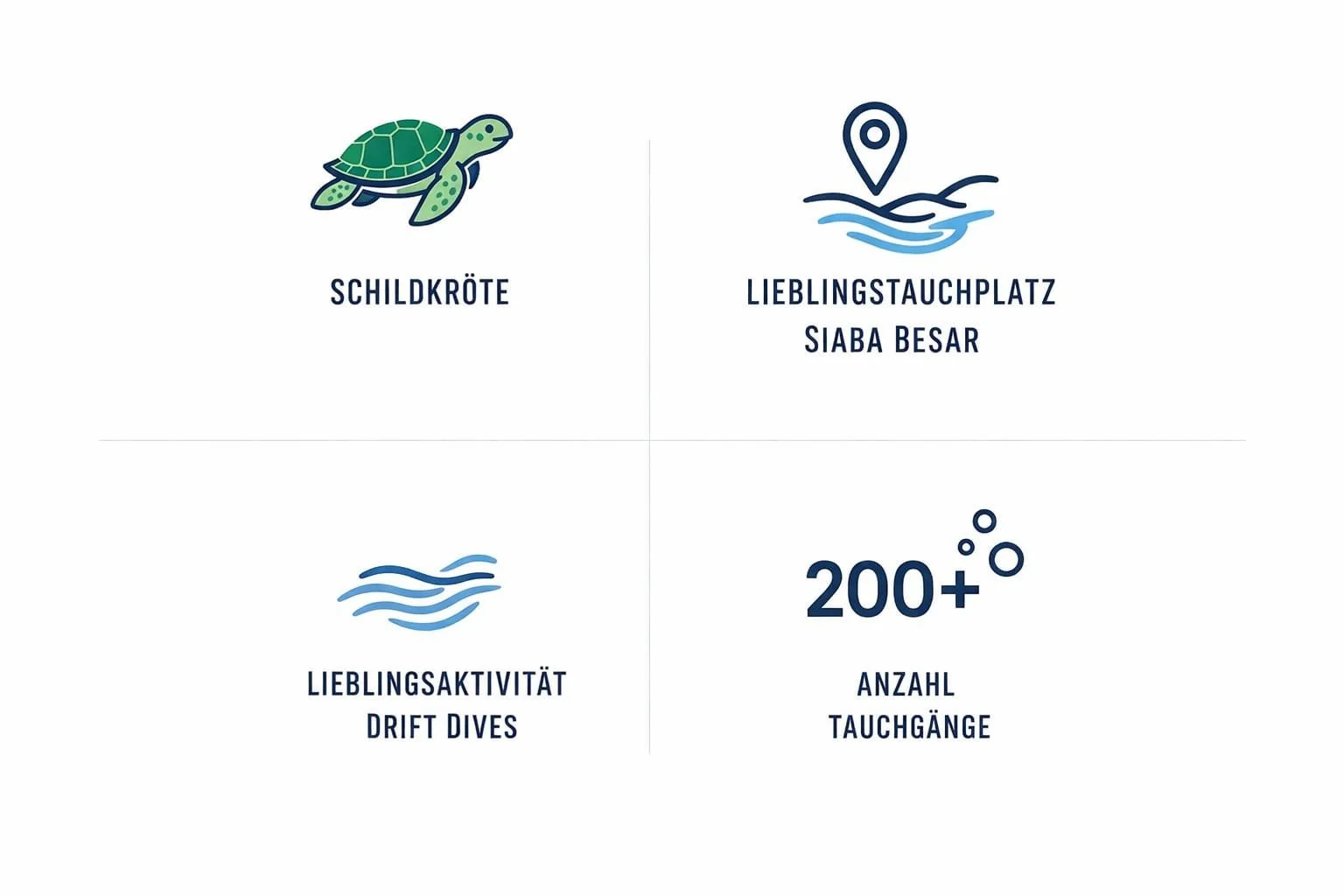 Besonders faszinieren mich unter Wasser Wasserschildkröten. Deshalb bleibt mir Siaba Besar im Komodo-Nationalpark in Indonesien, auch bekannt als „Turtle City“, besonders in Erinnerung. Ich war zwar nur einmal dort tauchen, aber die Anzahl an Schildkröten war beeindruckend. Überall waren sie zu sehen. Ihre ruhige, gelassene Art begeistert mich jedes Mal aufs Neue.
